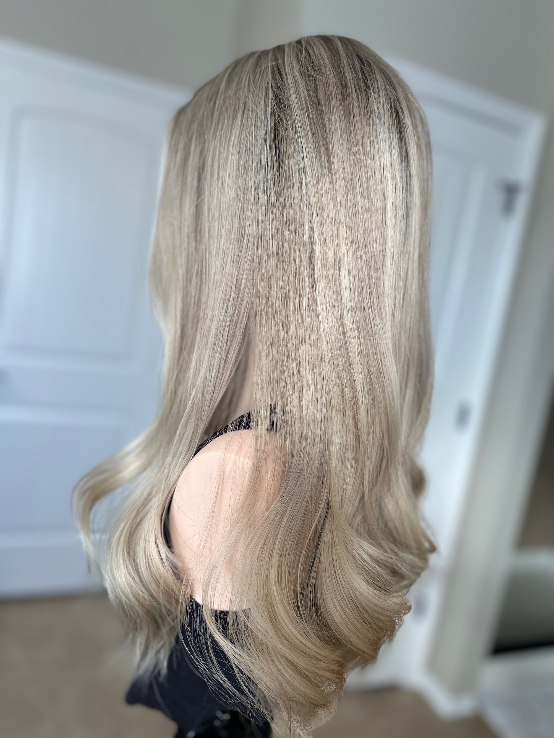 Style: lightly layered, gorgeous 6/7 neutral root melt into neutral dimensional blonde.
