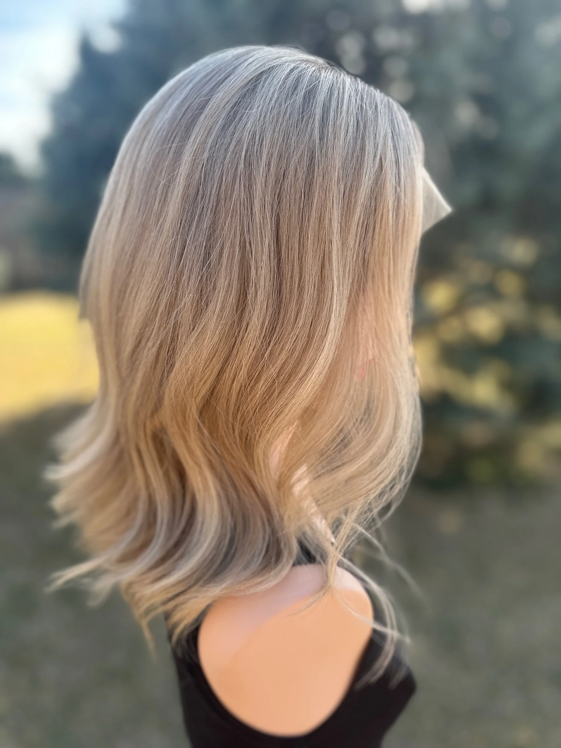 Beautiful, cool-toned blonde. This is a soft blonde with a whisper of ash in the shadow root, seamlessly mirrored in the lowlights throughout. Subtle variations of blonde create gentle dimension, but the overall effect is incredibly blended and natural.